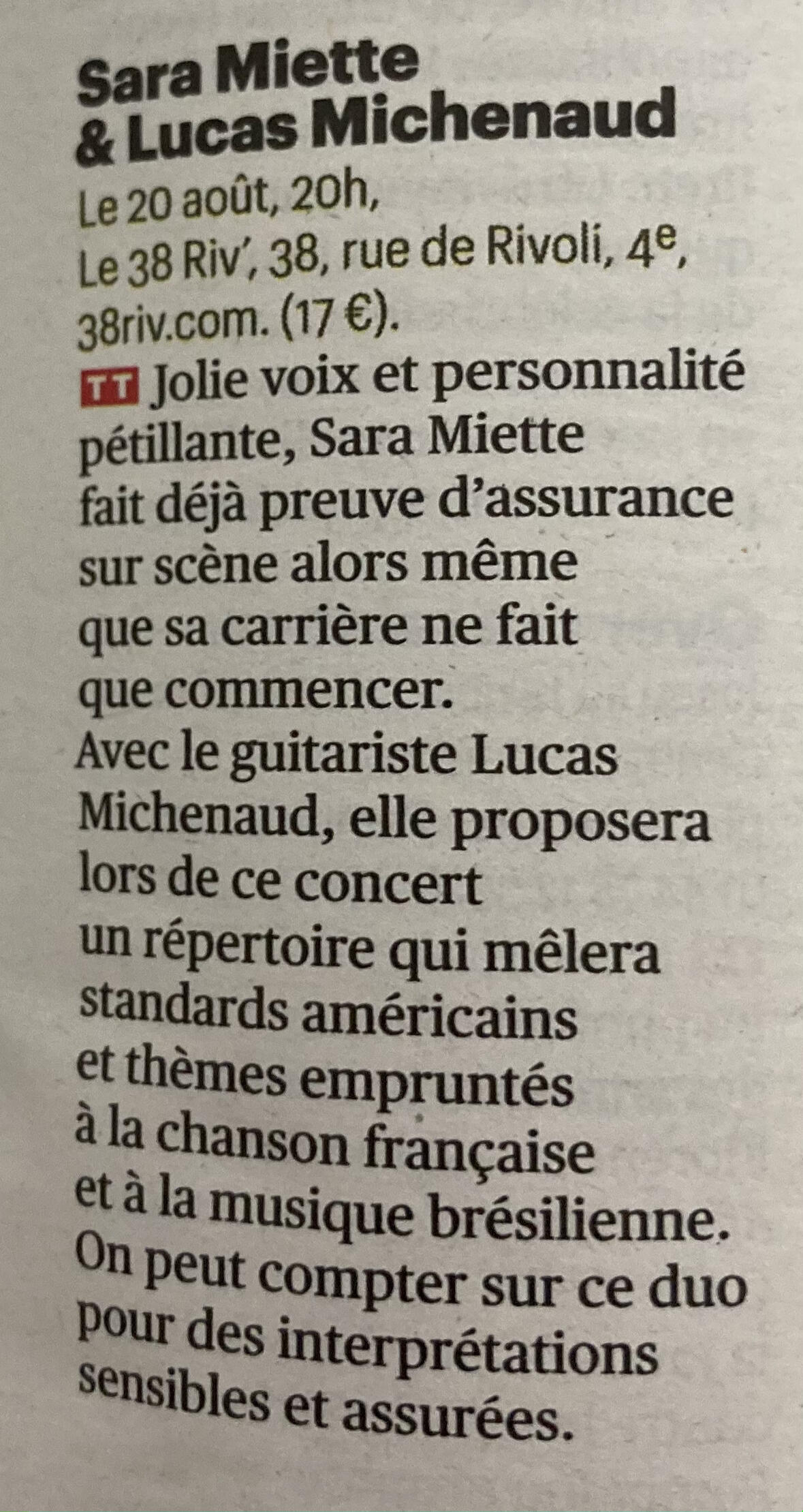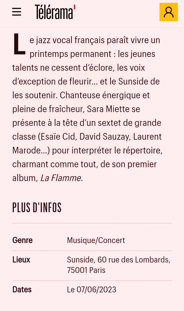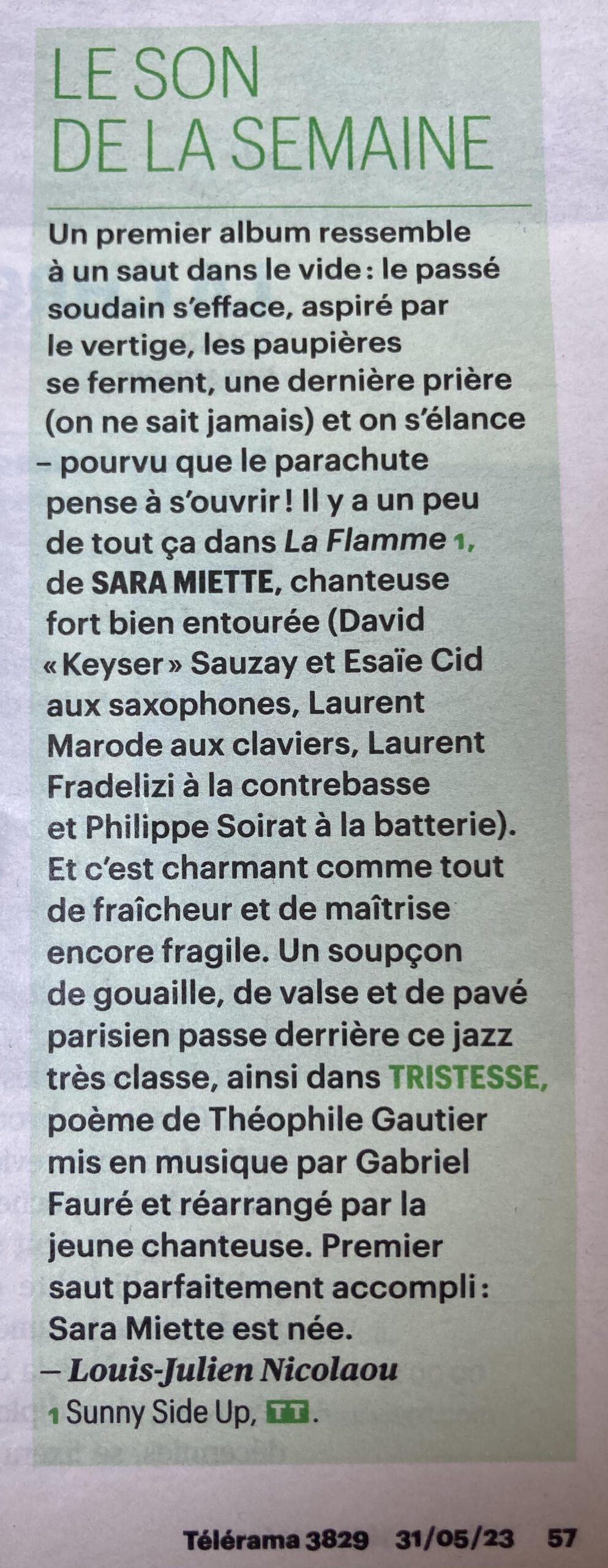 TELERAMA« Premier saut parfaitement accompli : Sara Miette est née »« Chanteuse énergique et pleine de fraicheur,